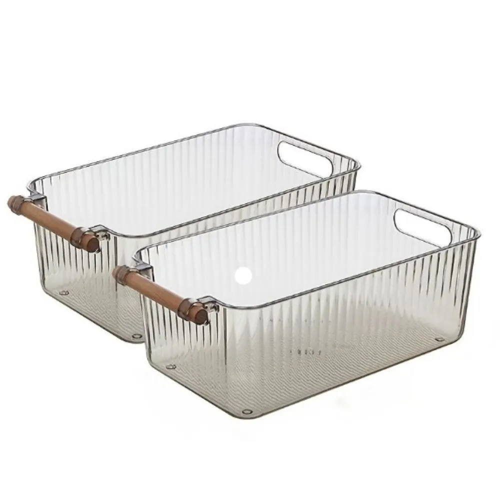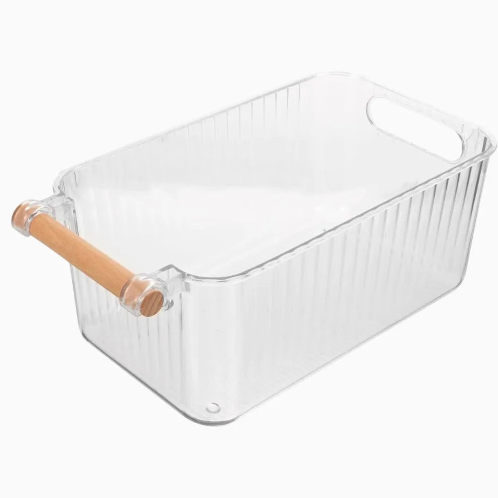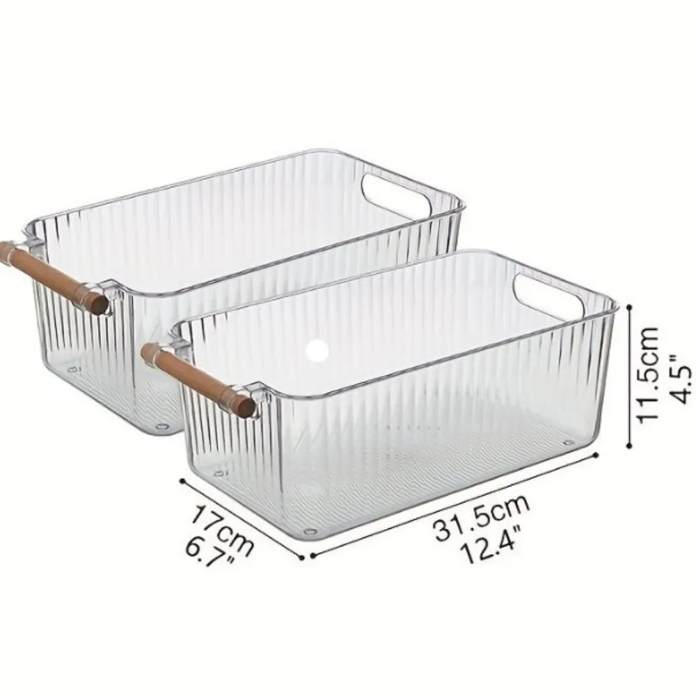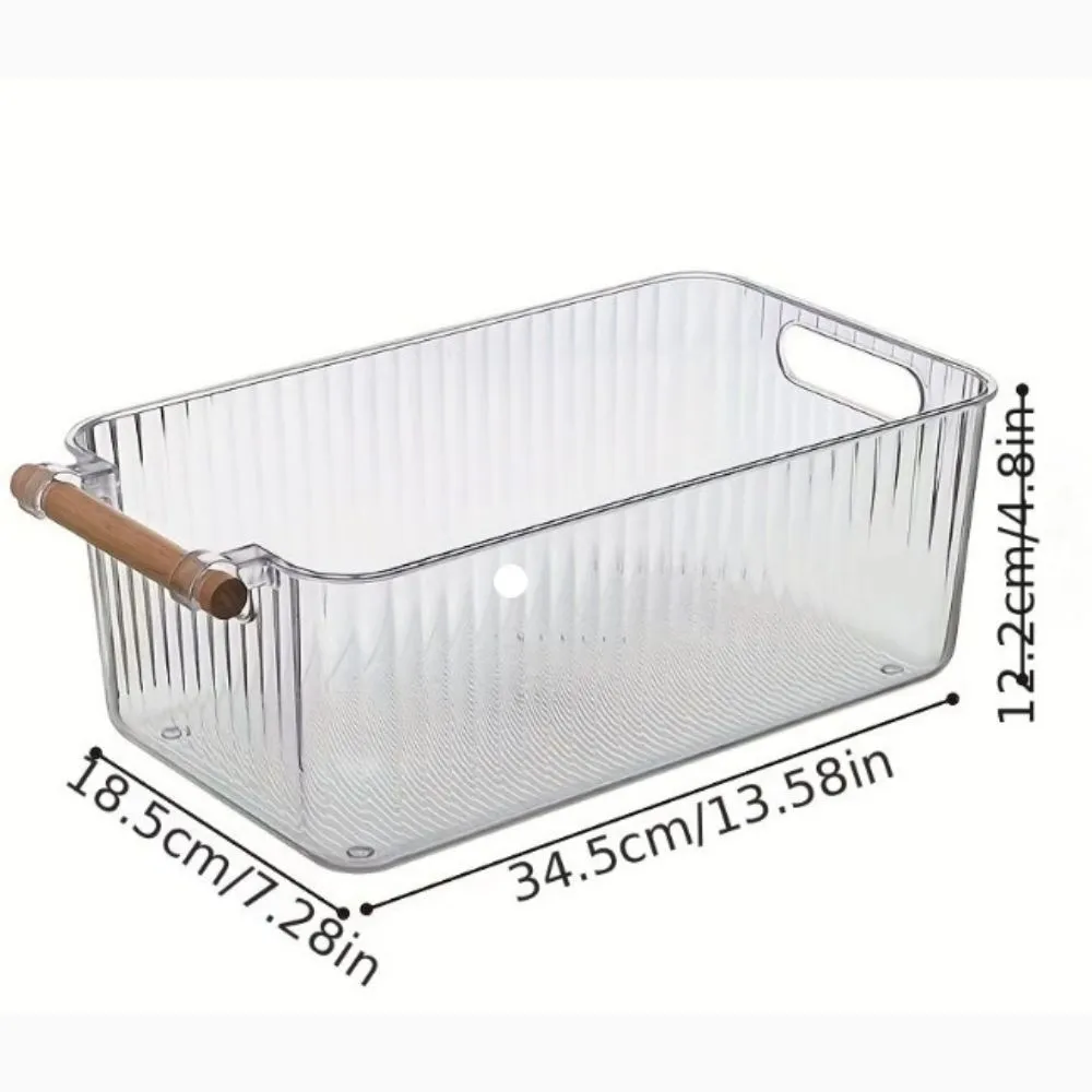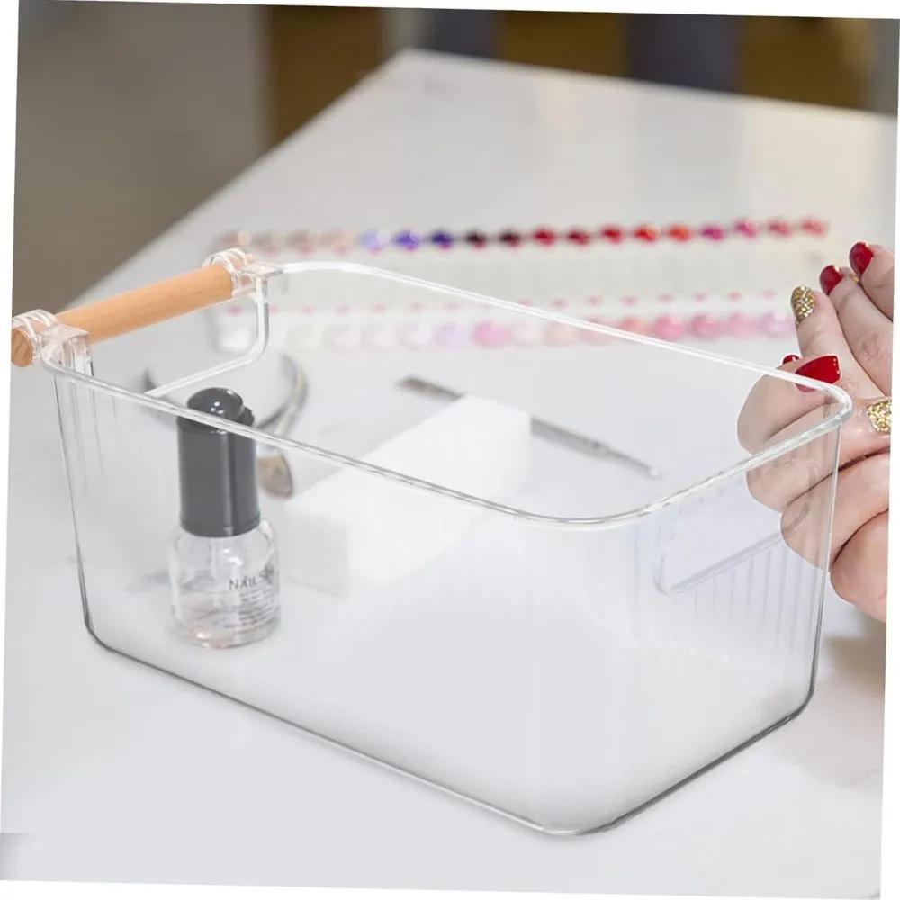 Bandeja acrílica organizadora con mango de madera, cesta de almacenamiento con mango de madera, caja de almacenamiento para artículos diversos del hogar, cesta de almacenamiento de maquillaje transparente, caja de almacenamiento de aperitivos de juguete con asa, estuche de almacenamiento de maquillaje simple para el hogar