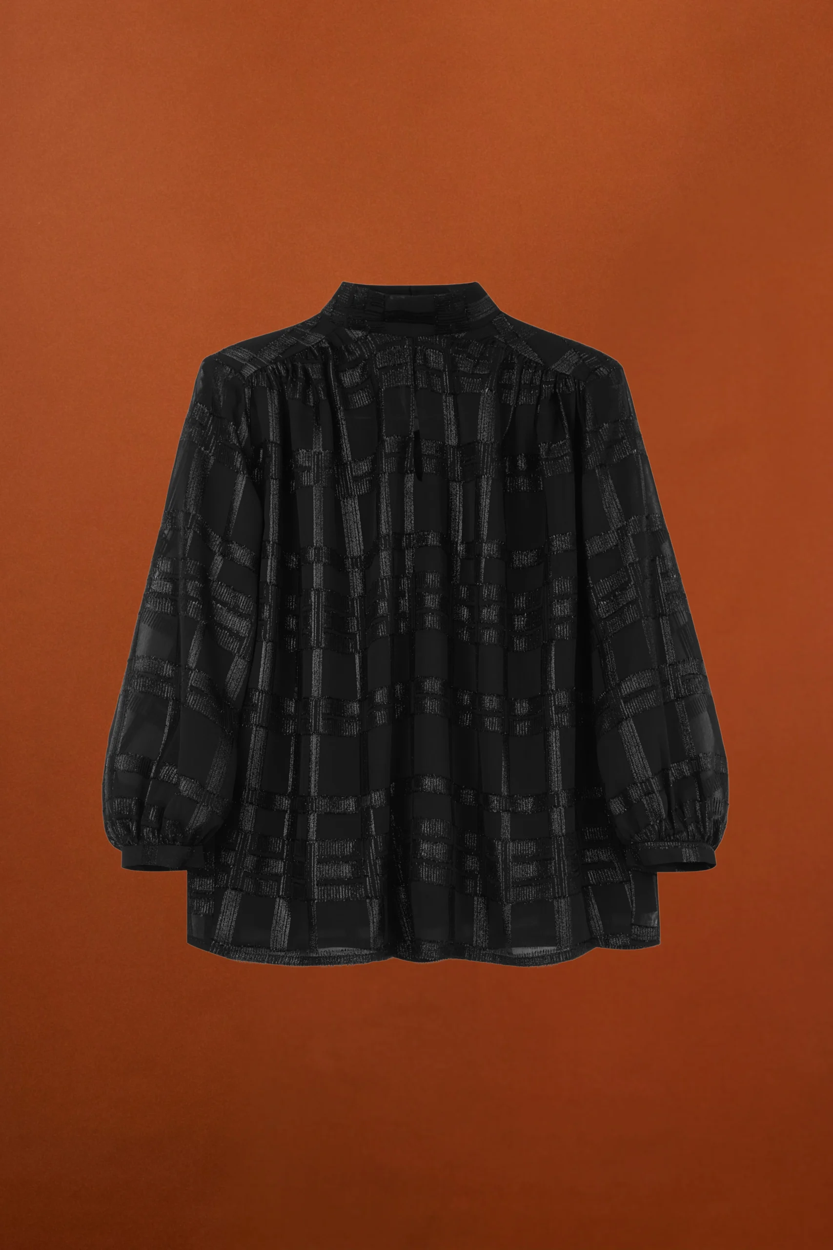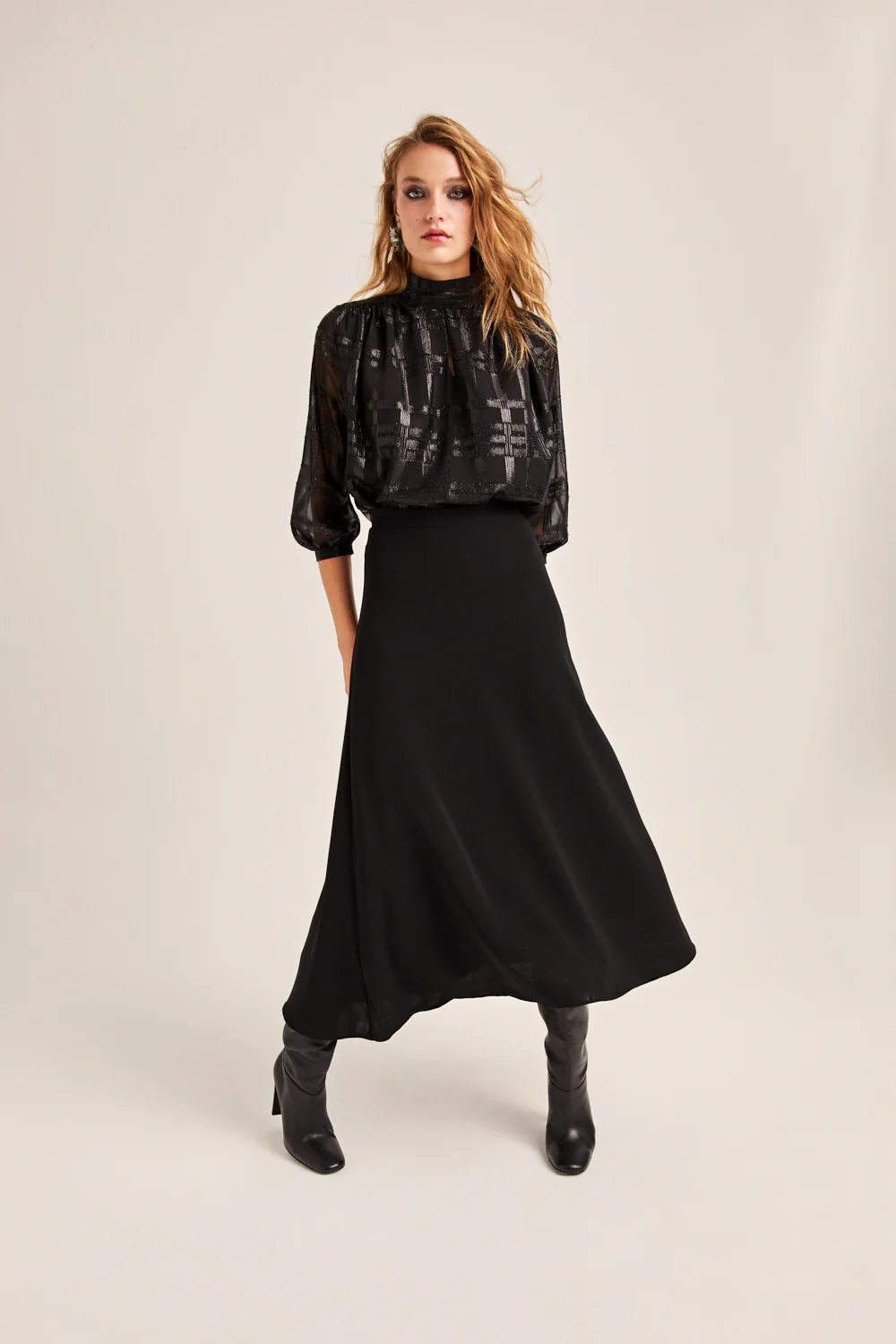 Blusa negra de manga tres cuartos con cuello subido y apertura con forma de lágrima en el escote. Esta blusa de fiesta tiene detalle en lúrex y se cierra por la espalda con un pequeño botón.