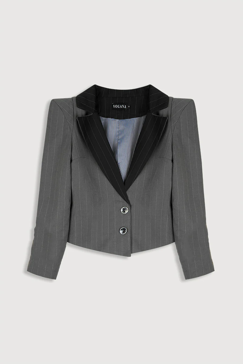Chaqueta con hombreras en color gris con raya dipomática y solapa a contraste. Está forrada y se cierra con dos botones en el delantero.