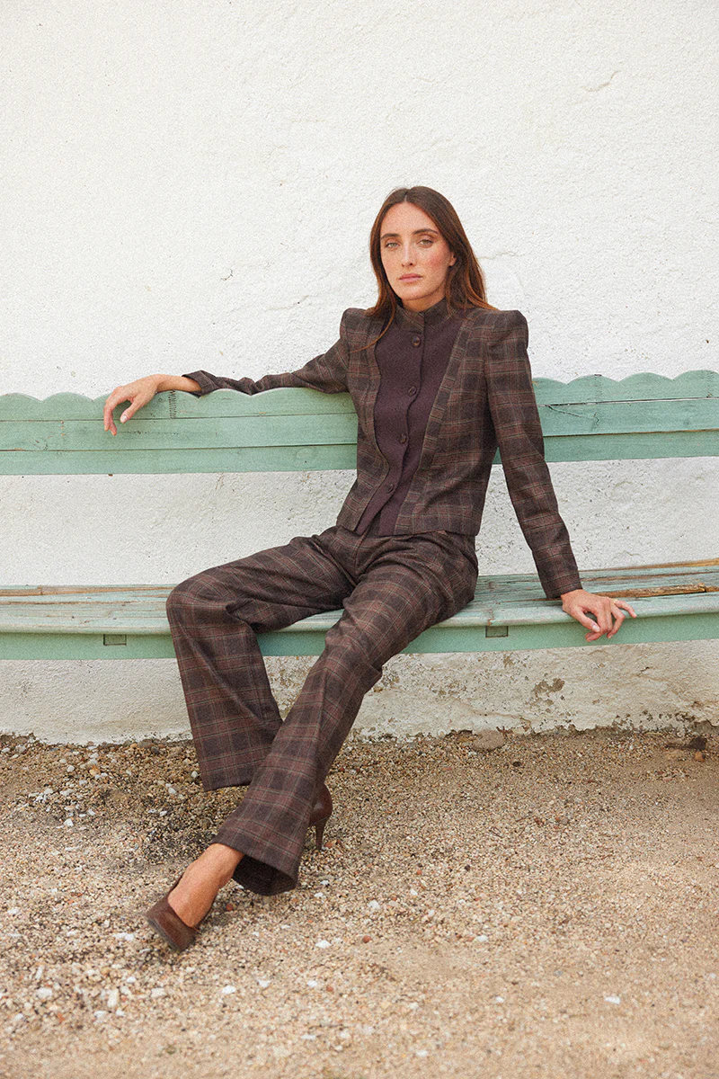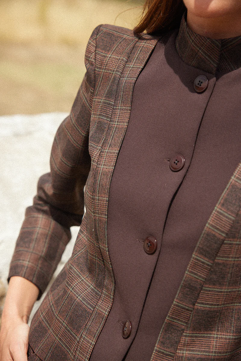 Chaqueta bicolor con cuello mao y hombreras con cuadros en tonos marrones. Detalle de chaleco a contraste en color marrón. Cuenta con forro interior y se cierra en el delantero con botones.