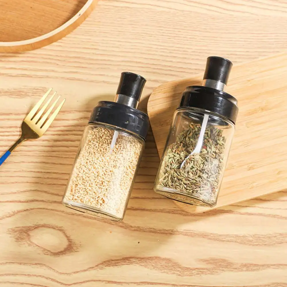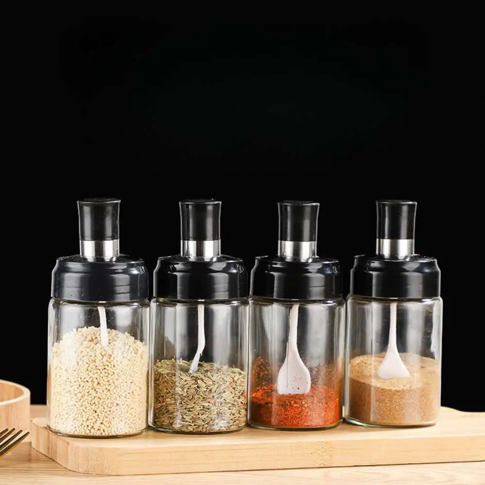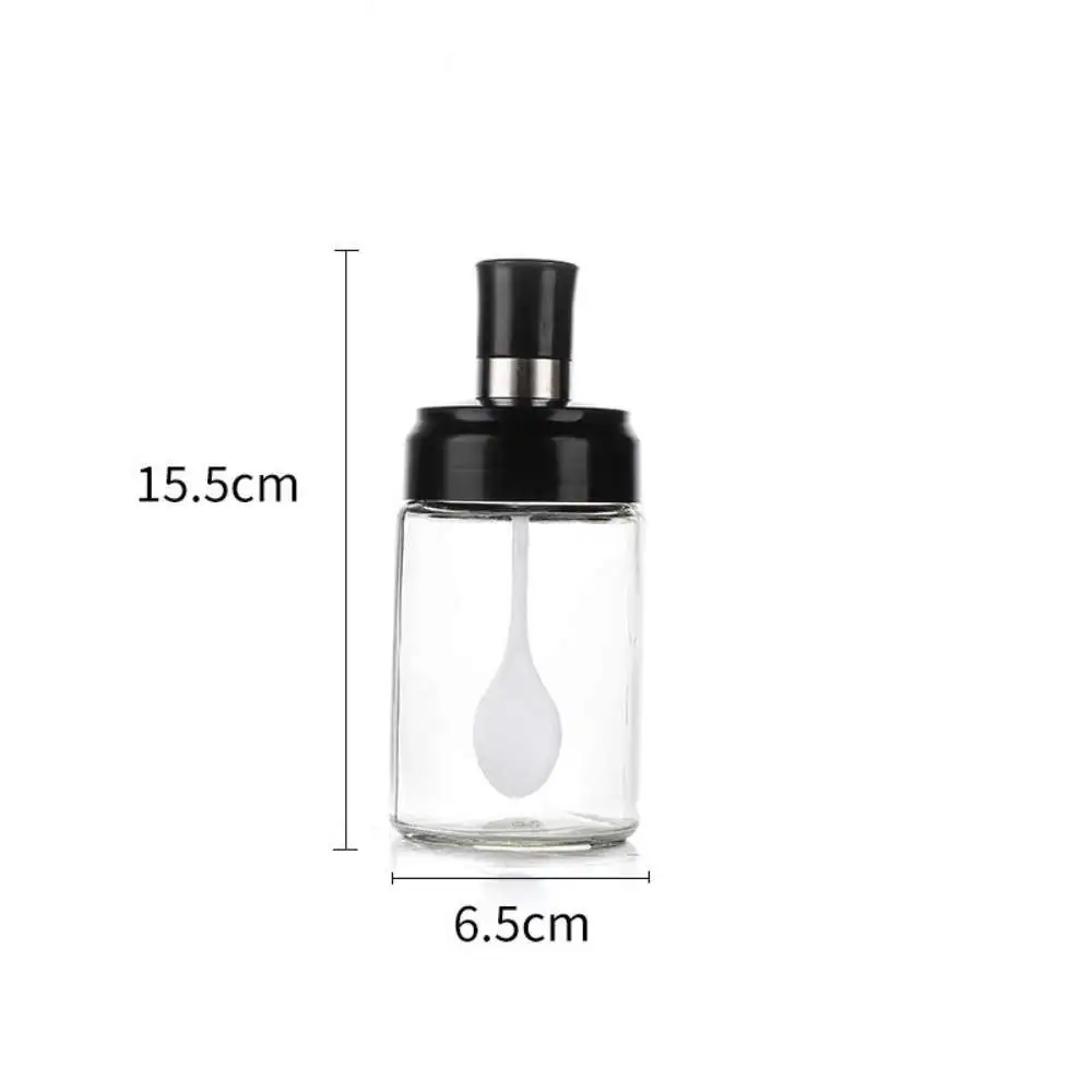 Condimentero de vidrio con cuchara, tarro de condimento integrado botella de condimento de vidrio caja de condimento de cocina olla de aceite de condimento para el hogar sal caja de condimento de esencia.