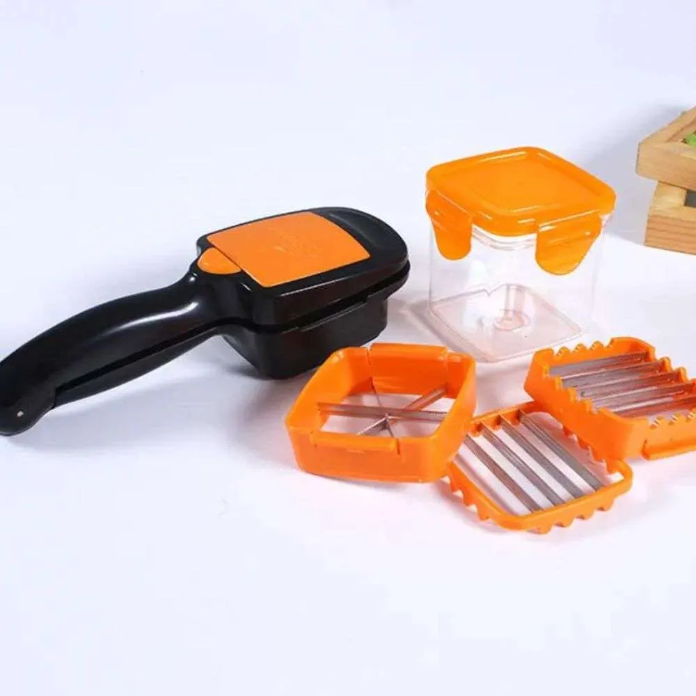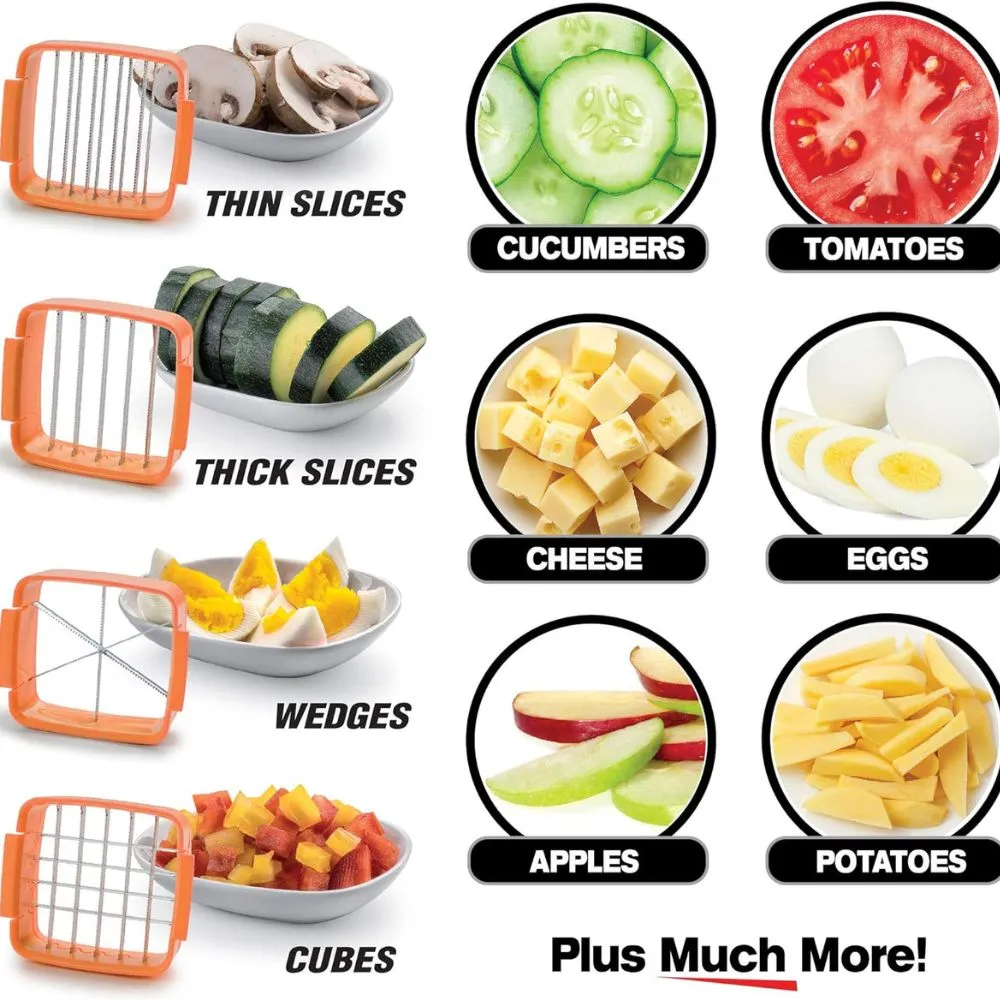 7 en 1 Cortador de alimentos, fresco de almacenamiento de verduras, cebolla, cortador de huevos con 3 cuchillas adicionales + 2 recipientes adicionales, picador de verduras.