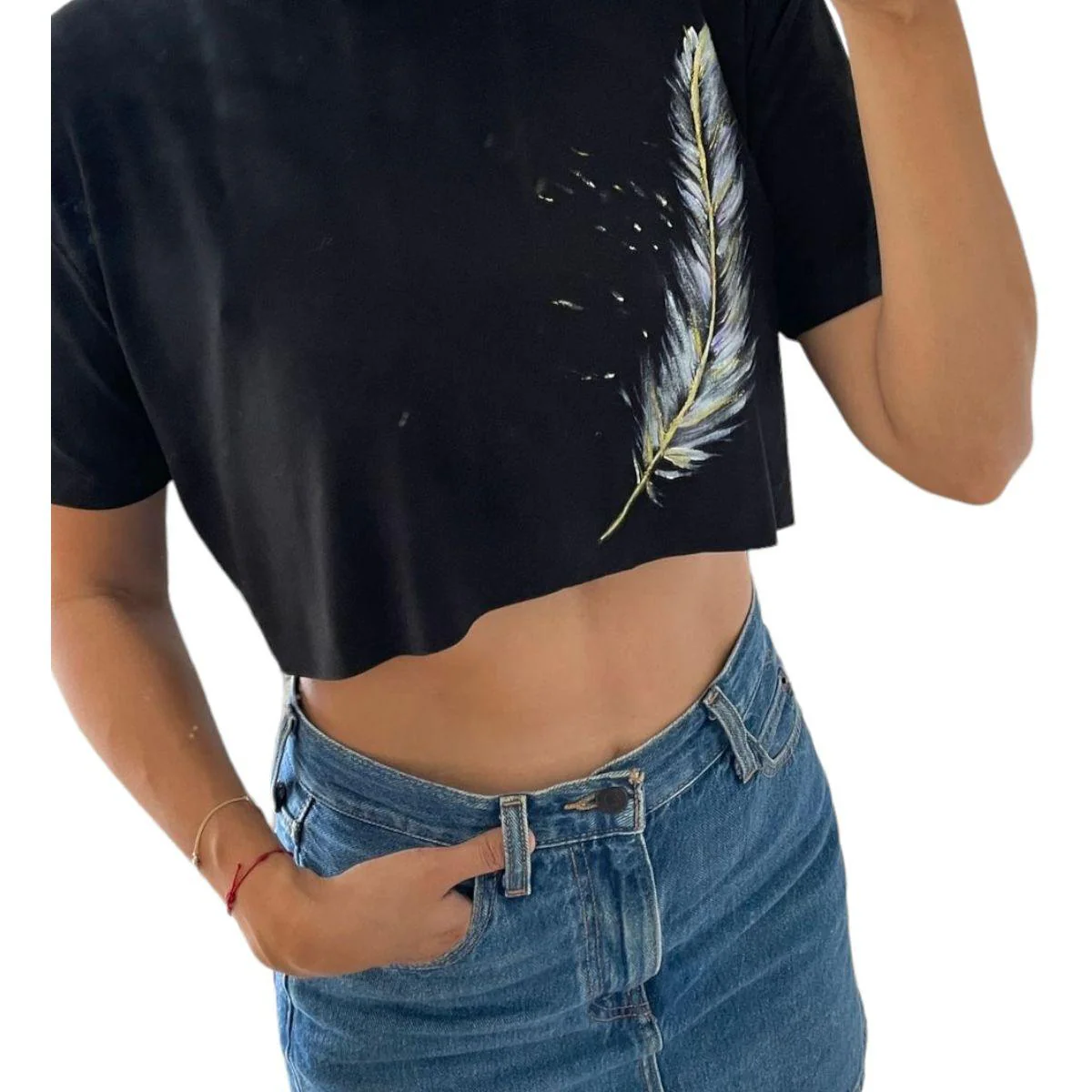 - Diseño Exclusivo: Cada top presenta un delicado diseño de pluma pintado a mano, haciendo de cada pieza una obra de arte única.
