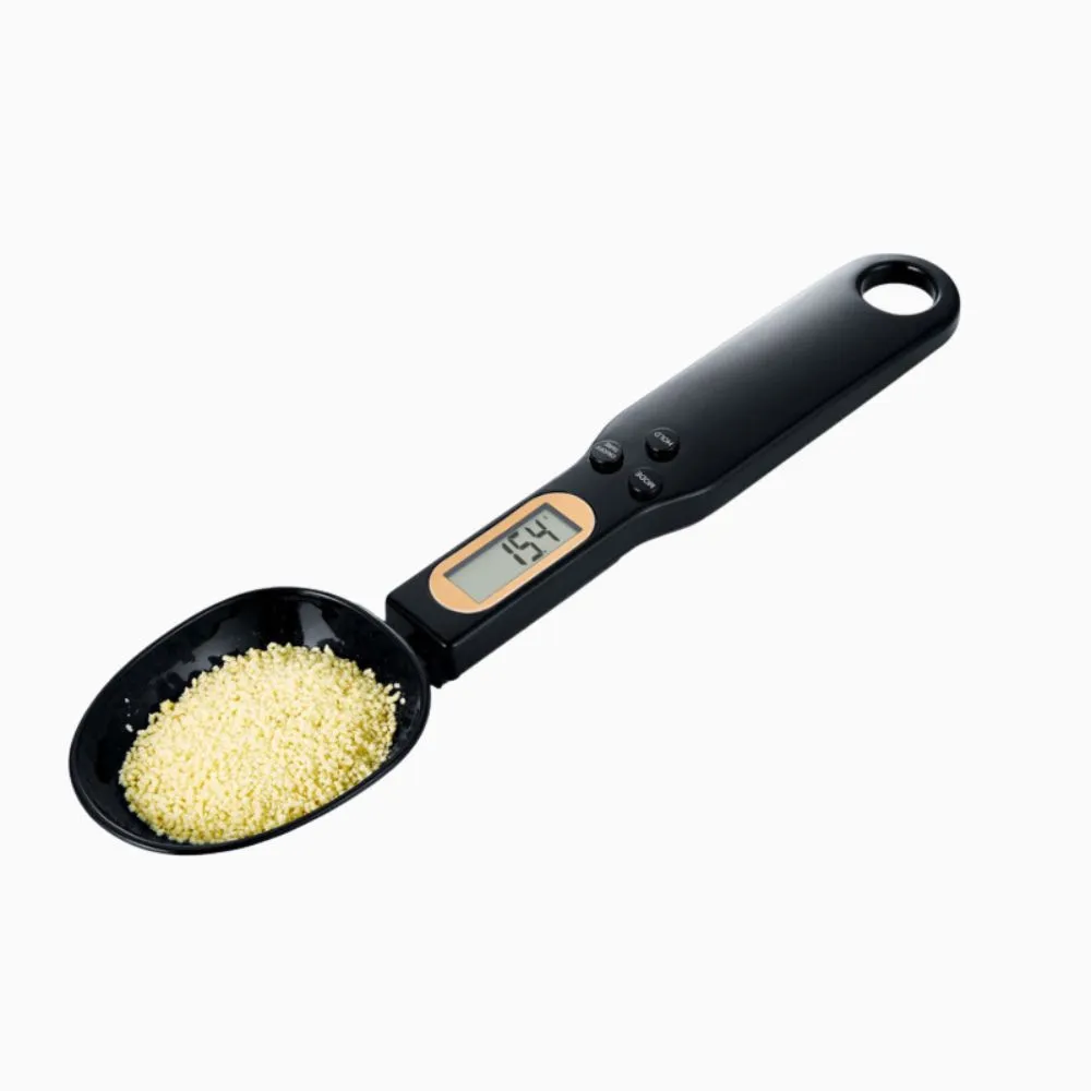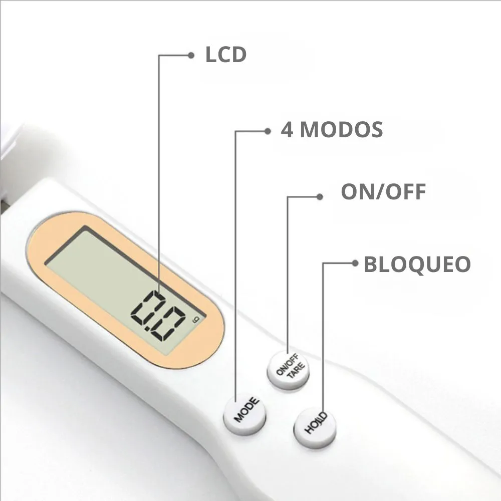 Va desde 1g a 500g con una legibilidad de 0,1 gramos. La cuchara tiene una escala de capacidad para un pesaje más preciso.
