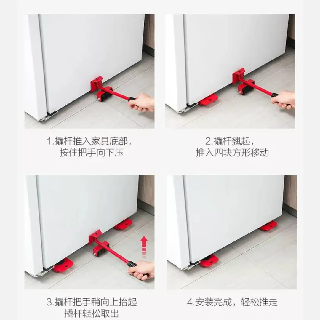 1. poner el elevador debajo de cada esquina del mueble y levantarlo (puede levantar sus muebles a 2.0 de alto). 2. Colocar los 4 deslizadores en las 4 esquinas del mueble a trasladar. 3. Empujar sin esfuerzo, el mueble para trasladarlo.