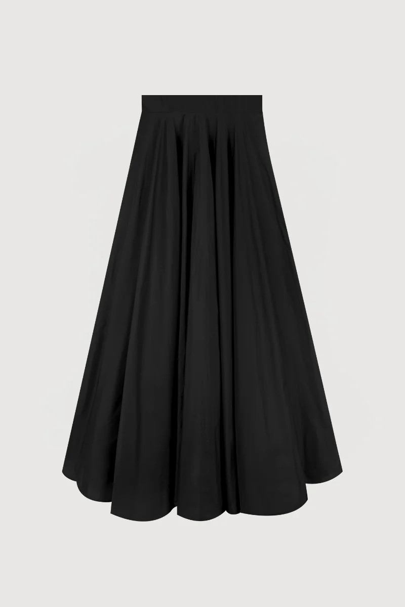 Falda de capa midi confeccionada en tafeta con cinturilla. Se cierra por la parte trasera con cremallera invisible.