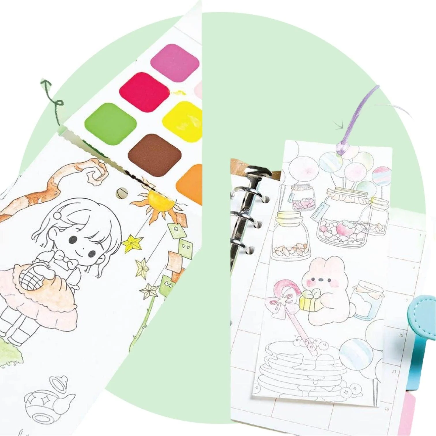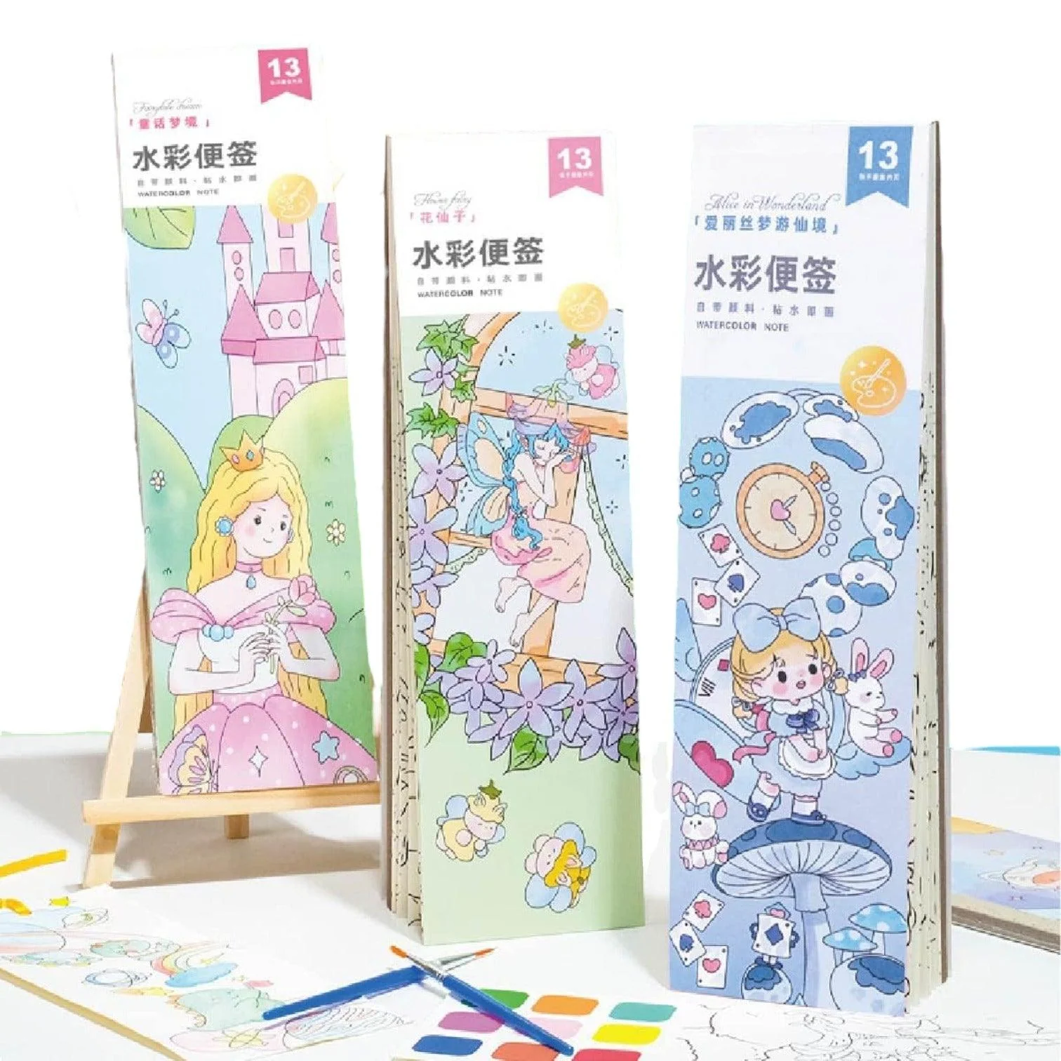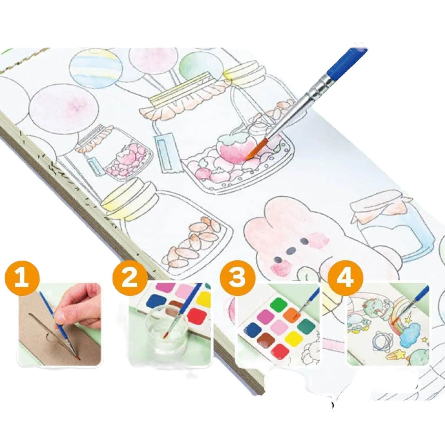Libro para pintar, cada pagina incluye 6 colores de acuarela. Perfecto para pintar y distraerse en cualquier momento. Por su tamaño es super portable. Incluye 1 pincel
