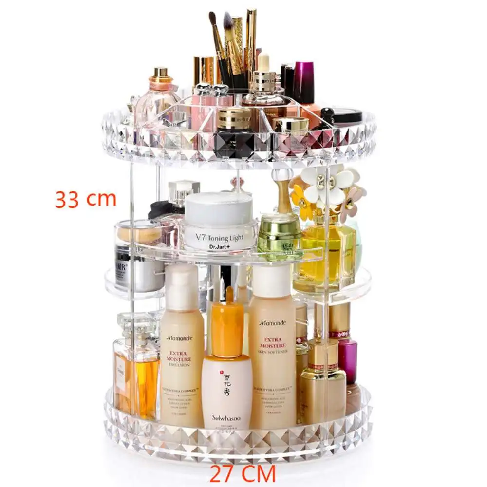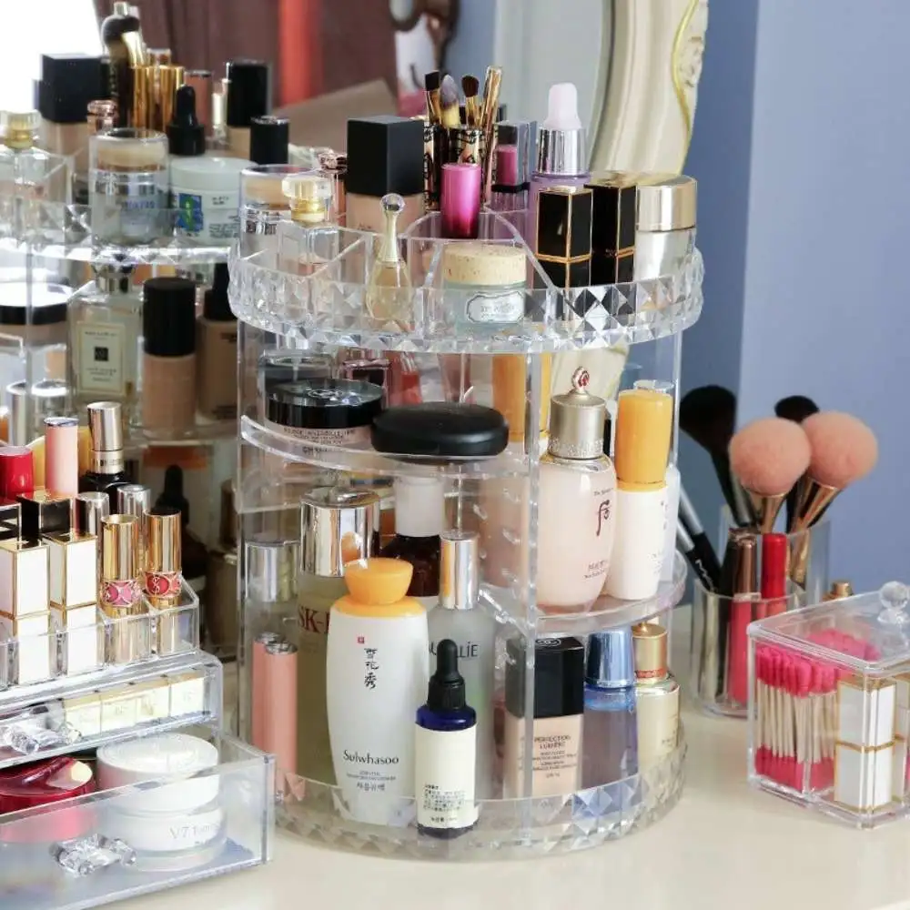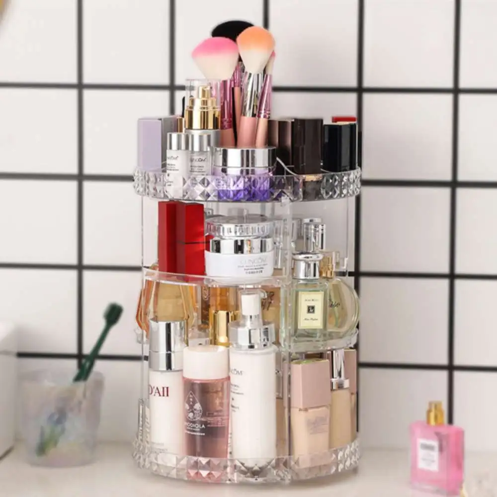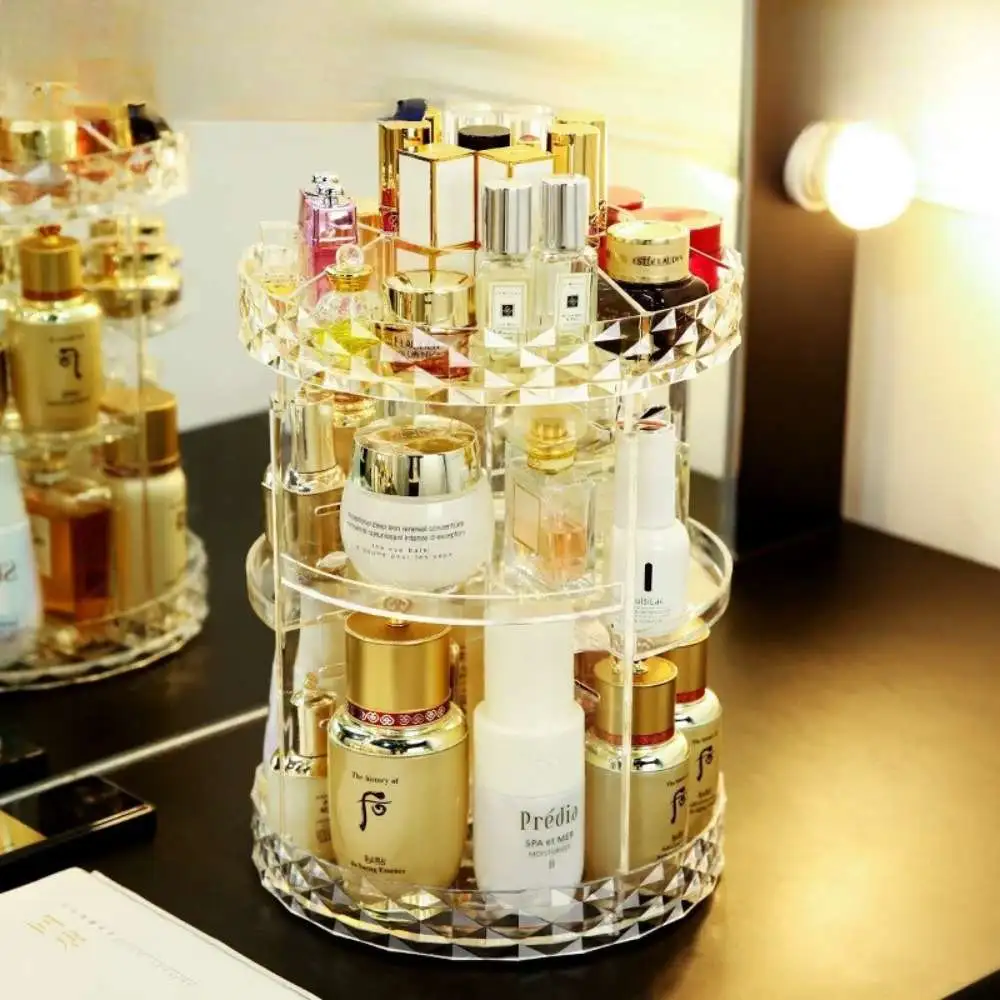 Organizador de Maquillaje Acrílico Giratorio 360 grados. Caja de almacenamiento de cosméticos con patrón de diamante, tocador giratorio transparente para el hogar, lápiz labial, cuidado de la piel, estante de almacenamiento de escritorio