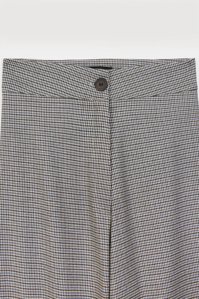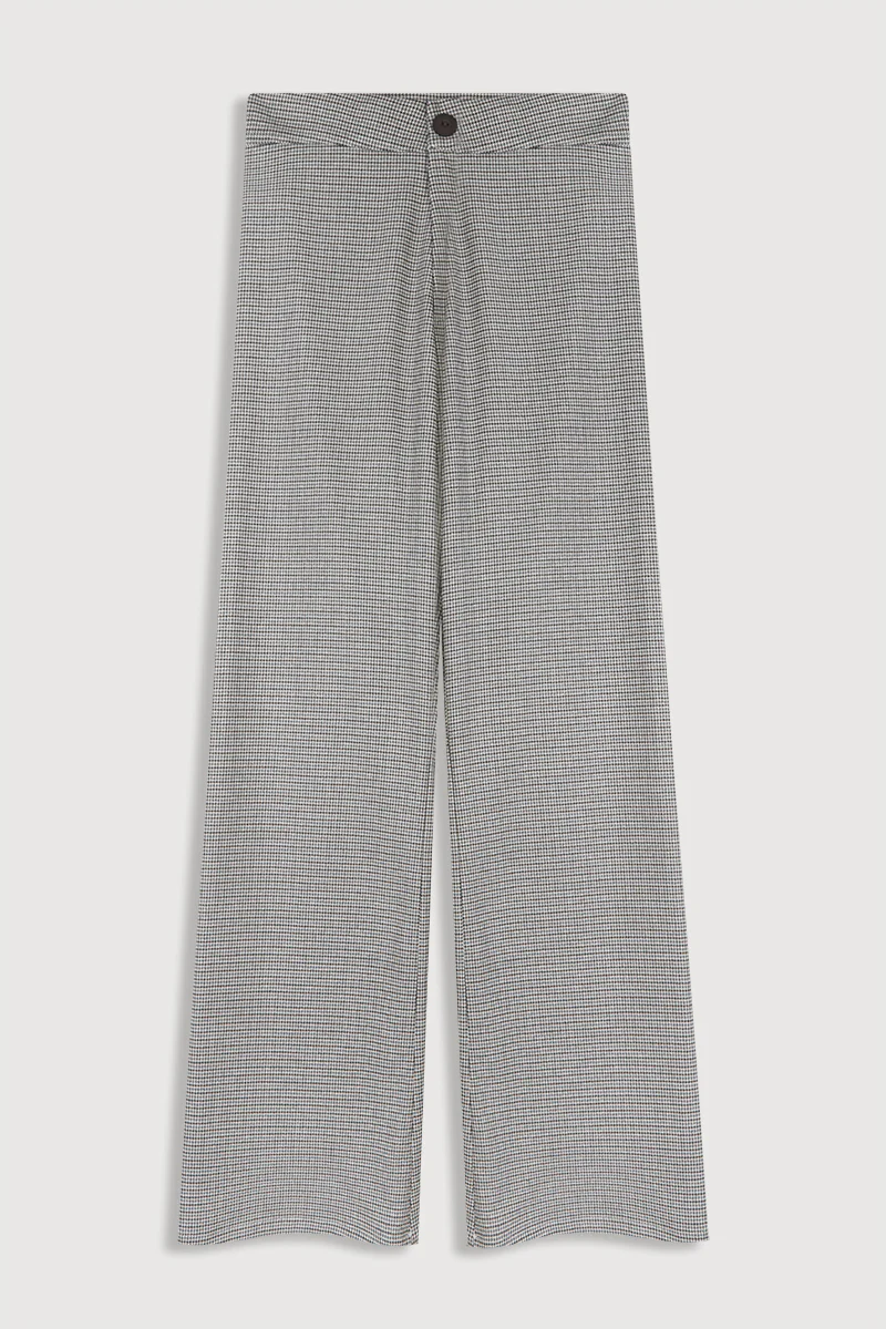 Pantalón estampado de pata de gallo con detalle de lúrex de talle alto con pernera recta. Este pantalón de fiesta se cierra con botón delantero.