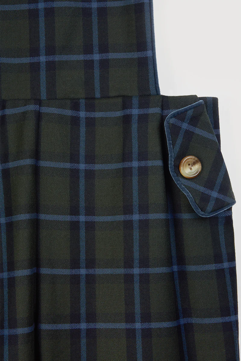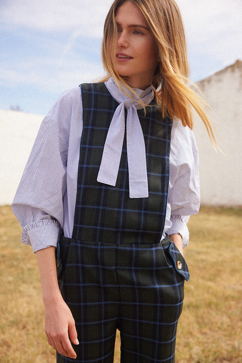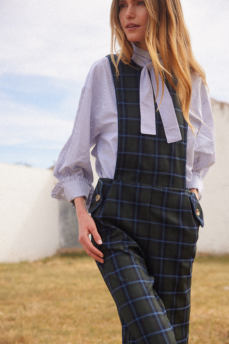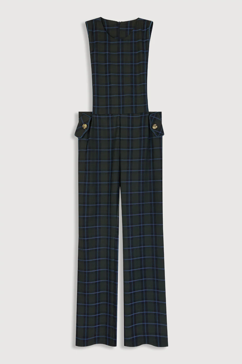 Peto de cuadros en color marino y escote a la caja. El pantalón tiene talle alto con pernera recta y bolsillos ribeteados al tono con detalle de botón. Se cierra por la parte trasera con cremallera invisible.