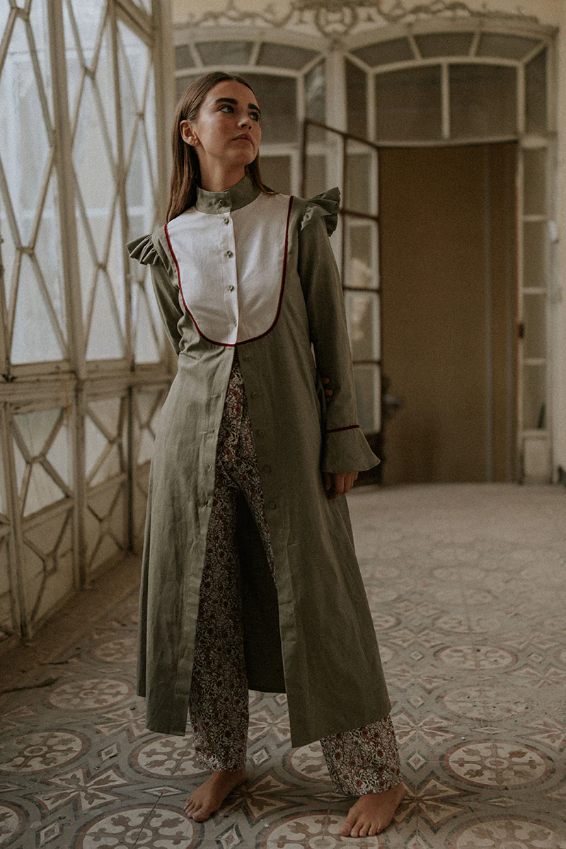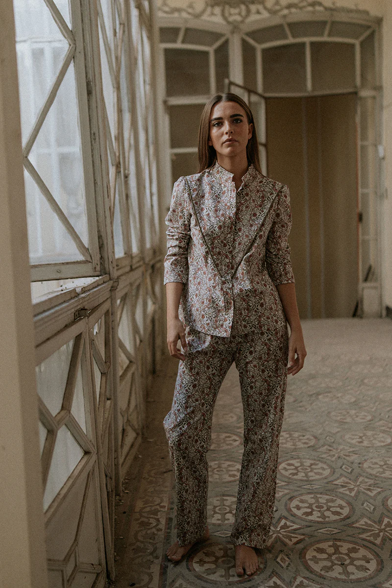 Pijama dos piezas estampado en flores rosa con cuello mao y detalle de solapa en forma de pico. La camisa se cierra por la parte delantera con botones y la solapa está viveada en terciopelo a contraste. El pantalón tiene elástico en cintura con lazada.