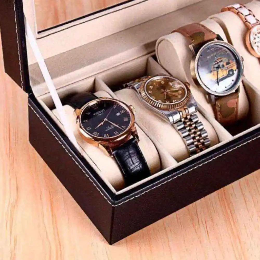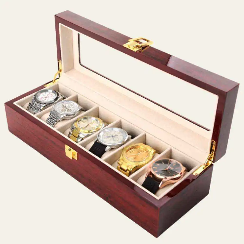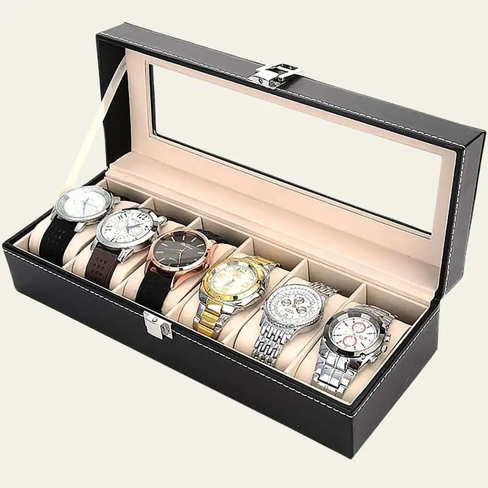 Porta Reloj para 6 piezas Caja de reloj de 6 ranuras de piel sintética con cerradura para reloj con tapa de cristal, portarelojes.