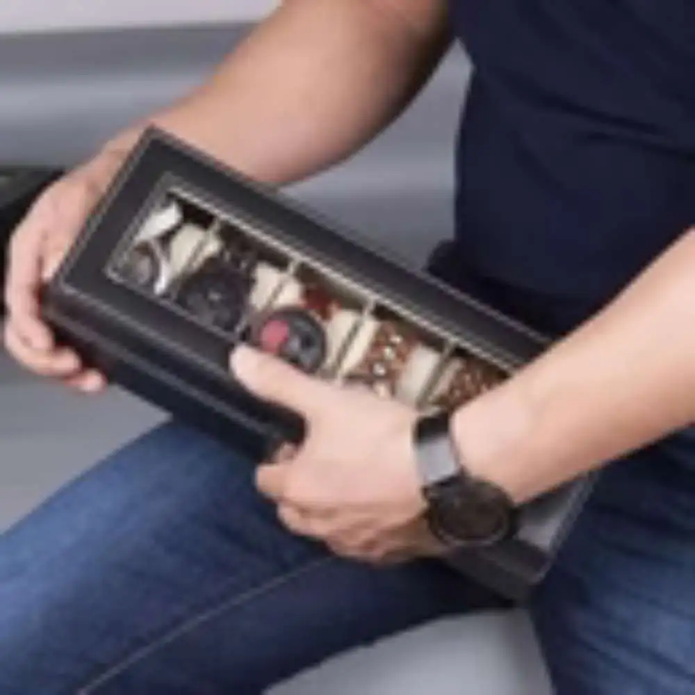 Adopta un elegante diseño de forma y piel sintética negra. Al mismo tiempo, en la parte superior de la caja, se diseña un vidrio de alta transparencia, que no es fácil de romper y fácil de limpiar y limpiar. Mientras protege tus joyas del polvo, también es conveniente para que aprecies y muestras tus relojes, collares, pulseras.