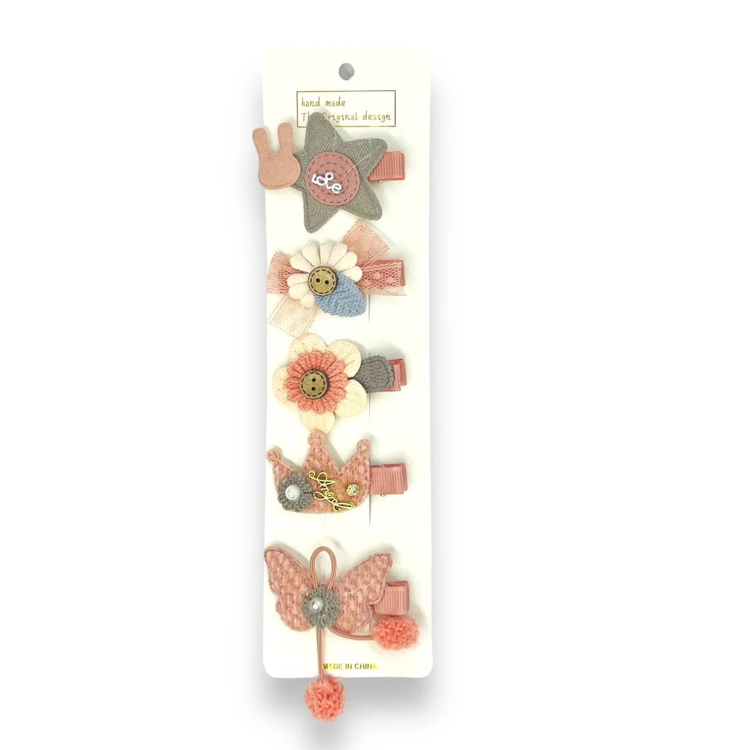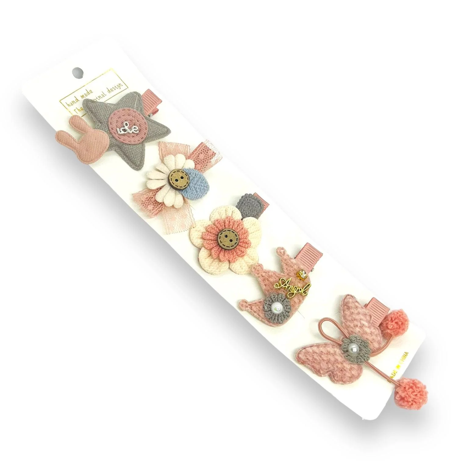 Blister con 5 accesorios para pelo de bebe y niñas. Cada gancho mide 5cm y está forrado en cinta para mayor cuidado de la cabecita de tu pequeña.