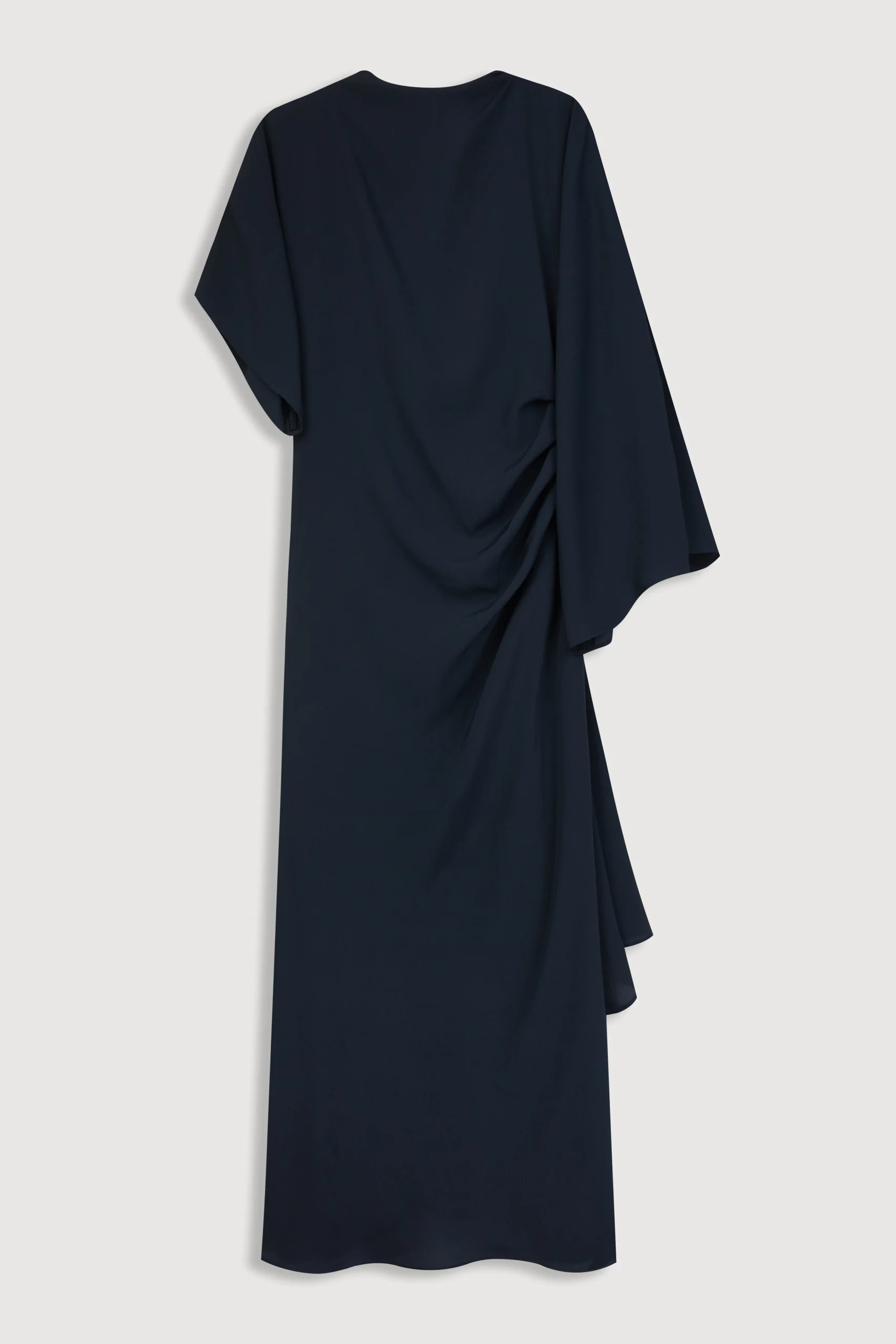 Vestido midi con falda drapeada asimétrica y apertura lateral. Este vestido de fiesta tiene escote a la caja y mangas también asimétricas. Tiene forro y se cierra en la parte trasera con cremallera invisible.