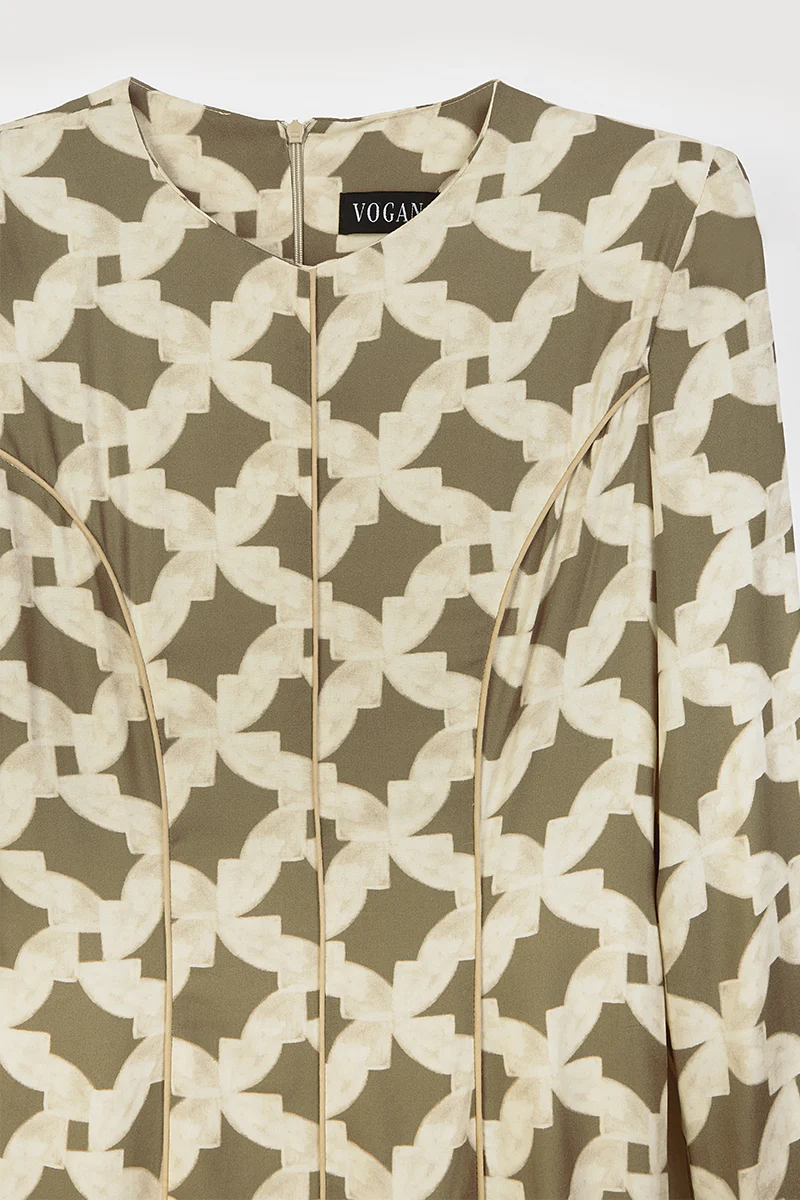 Vestido midi con estampado en color beige y crudo. Este vestido tiene cuello a la caja, detalle de vivos a contraste y hombros estructurados. Tiene forro interior y se cierra por la parte trasera con cremallera invisible. Cinturón a juego con hebilla efecto hueso.