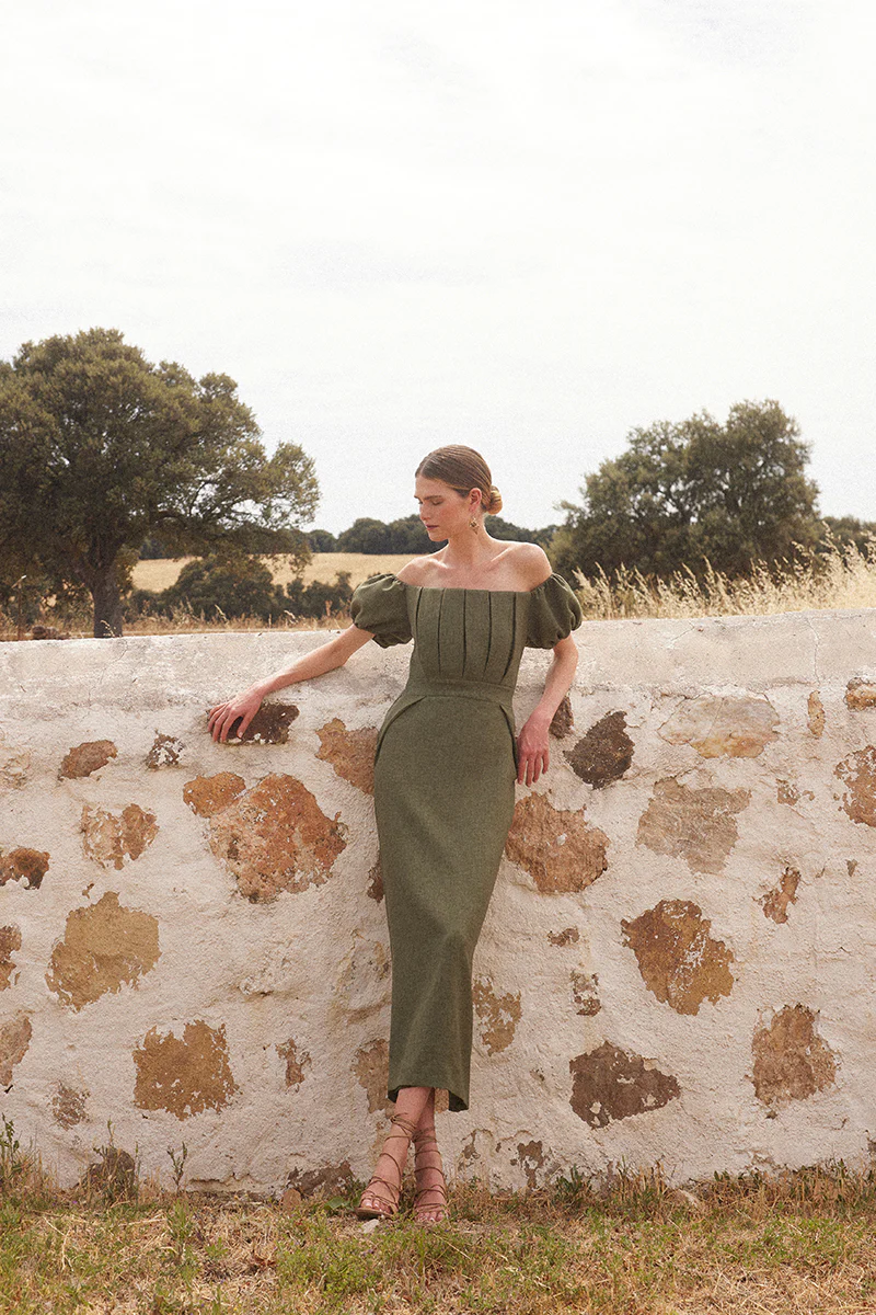 Vestido midi en color verde con cinturilla y corte recto. Este vestido tiene mangas abullonadas con elástico que permiten dejar los hombros descubiertos y tableado en pecho. Tiene apertura trasera en la falda, forro interior y se cierra por la parte trasera con cremallera invisible.